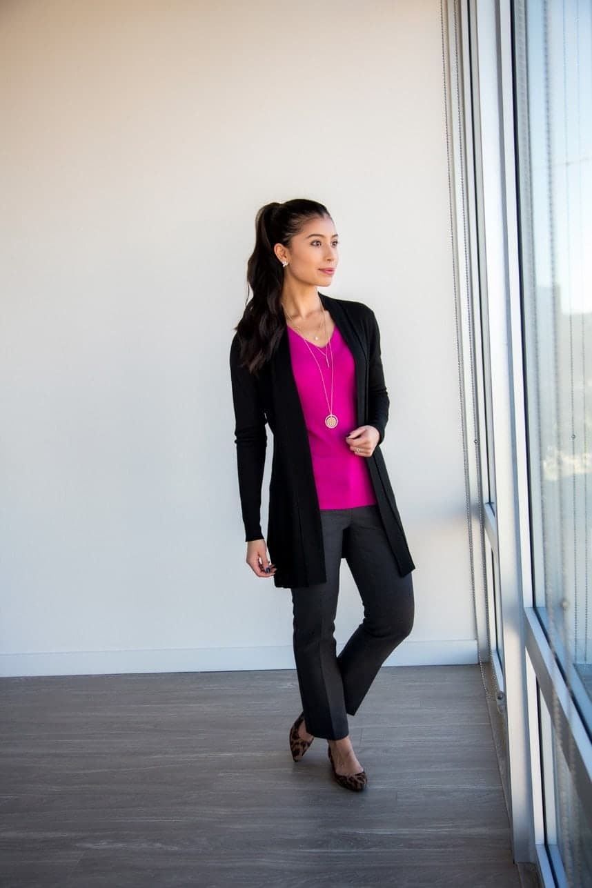 Mon favori : le pull col V manches longues (le rose vif sur la photo ci-dessous). Il se glisse sur une chemise à col rayé pour un contraste graphique, et se marie parfaitement avec un pantalon noir classique. Autre must-have : le long cardigan noir, à associer au pull rose ou à n’importe quel autre look, particulièrement en automne ou en hiver. C’est la pièce caméléon, facile à enfiler en cas de coup de froid.