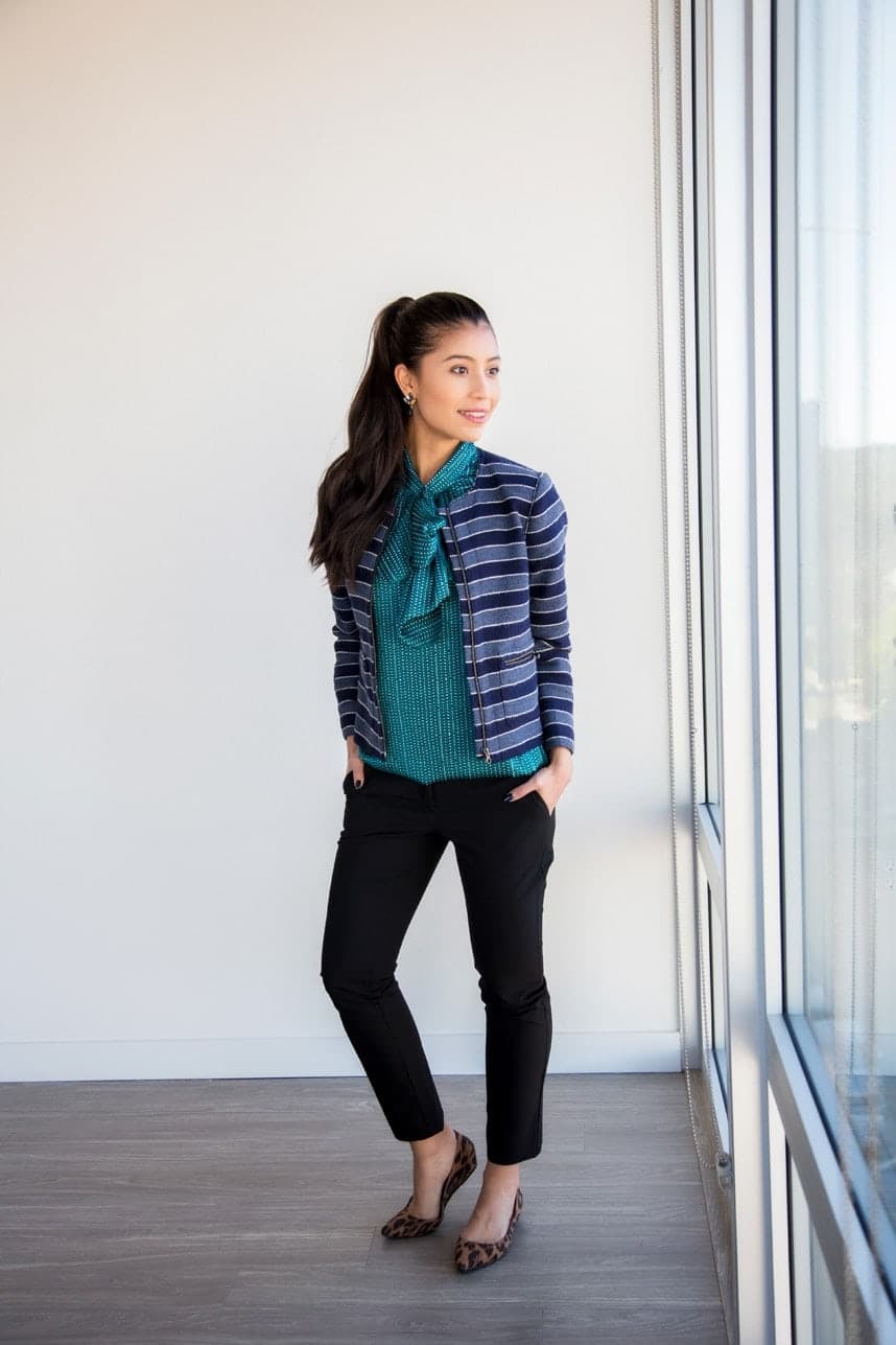 Il fait souvent frais au bureau : même un top sans manches se porte bien sous un blazer. Exemple concret : un haut vert à pois, glissé sous un blazer rayé, illumine la tenue tout en restant pro. Ce genre d’association donne du relief à l’ensemble et montre que le business casual n’est pas synonyme de monotonie.