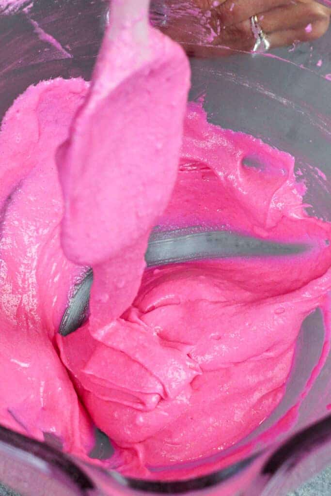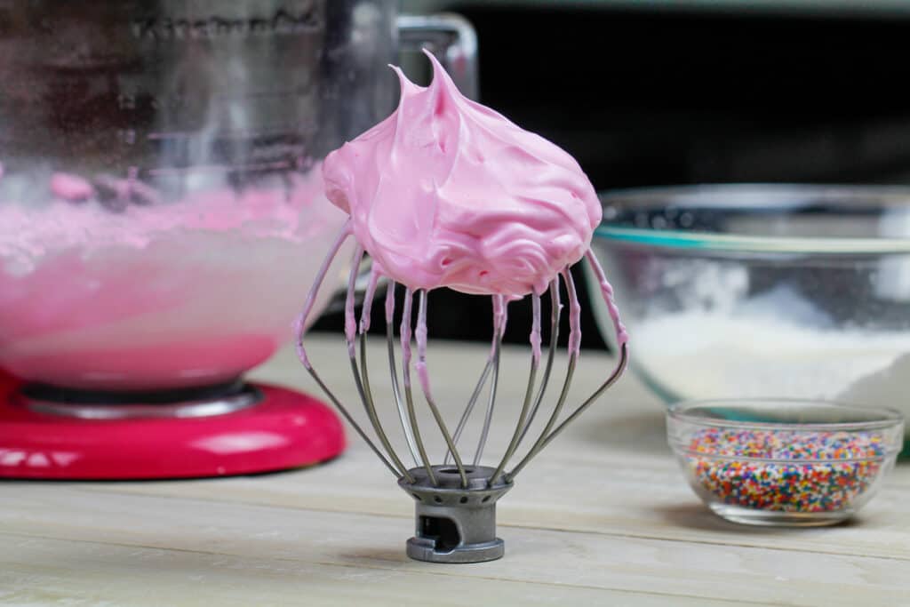 Battez les blancs d’œufs à vitesse moyenne pour obtenir des pics mous, commencez alors à verser doucement le sucre en poudre. Pour une touche colorée, ajoutez un peu de colorant en gel, ici, le rose est à l’honneur.