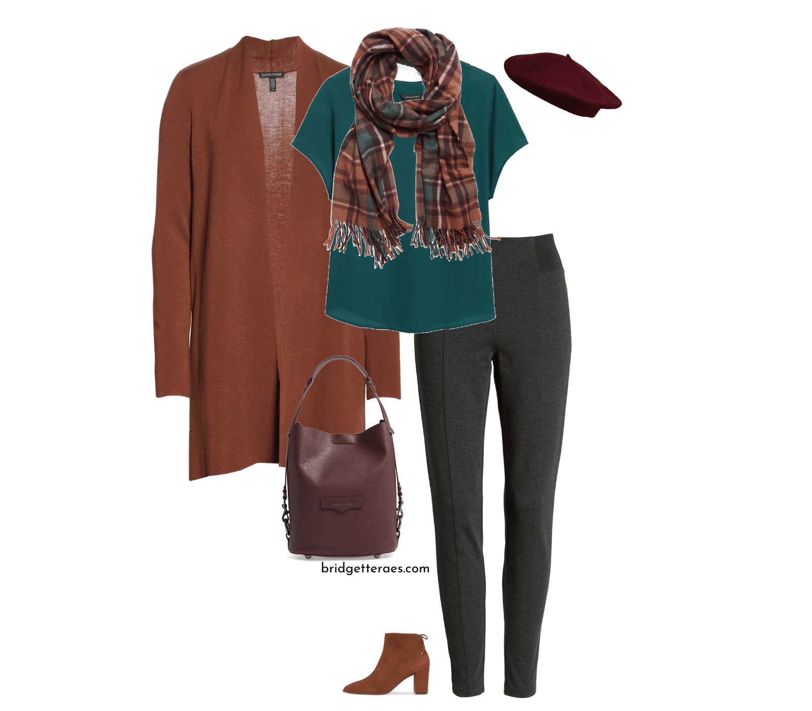 Dernière option : le marron s’anime au contact de la couleur. L’écharpe à carreaux Banana Republic lie l’ensemble, sur un cardigan Eileen Fisher, un haut bleu sarcelle et un pantalon gris Halogen. Un béret bordeaux et un sac Rebecca Minkoff injectent la touche vive, tandis que des bottines marron Stuart Weitzman ancrent la tenue. Une démonstration concrète de la vitalité du marron, loin des clichés.
