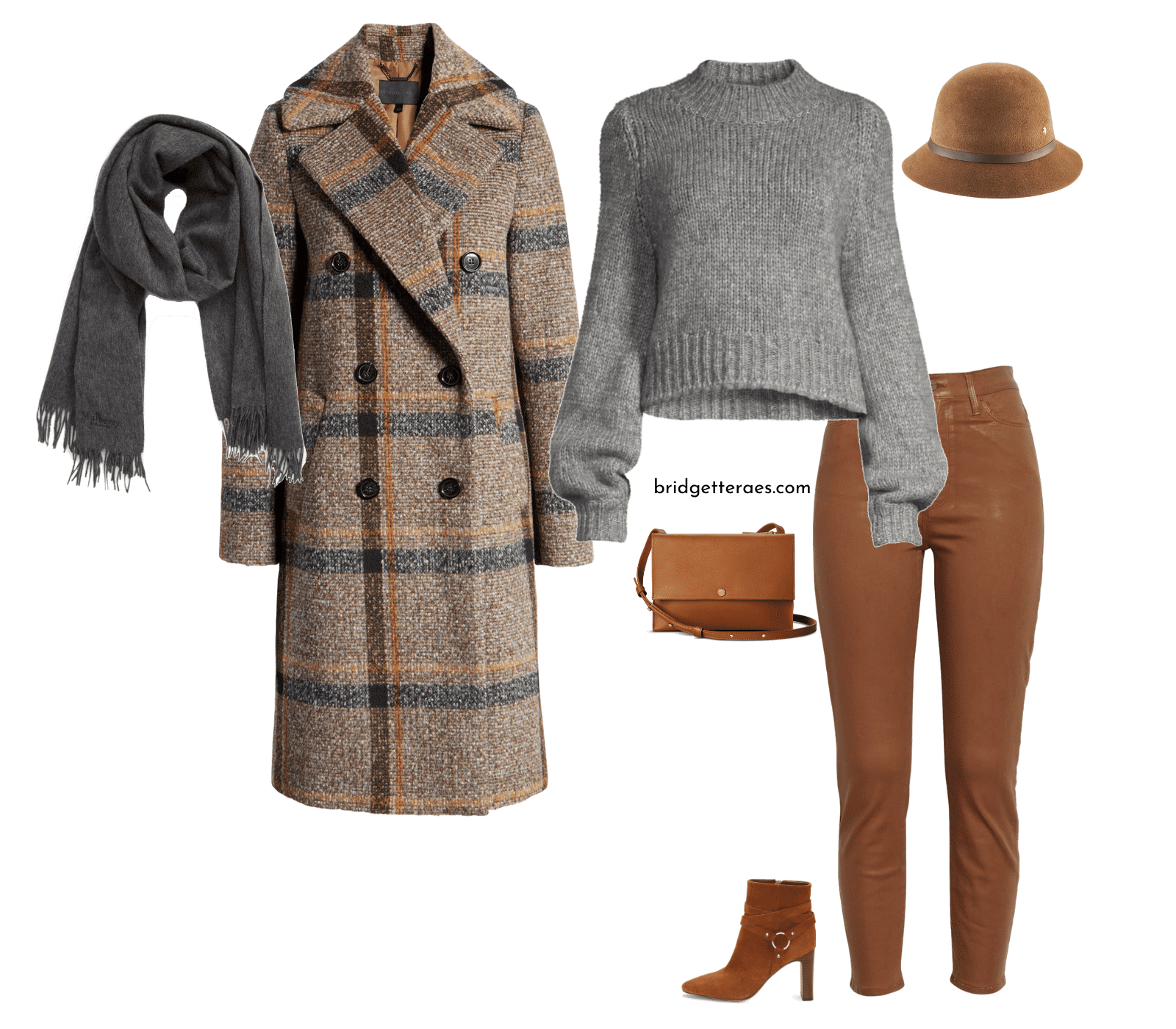 Ce second look fait la part belle aux contrastes subtils. Les bottines marron Vince Camuto, associées à un sac Shinola, posent la base. Un jean skinny enduit Frame s’accorde à un pull gris The Kooples, le tout sous un manteau à carreaux marron. Accessoires choisis avec soin : un chapeau cloche Helen Kaminski et un foulard gris Mulberry, pour une allure sophistiquée sans effort.