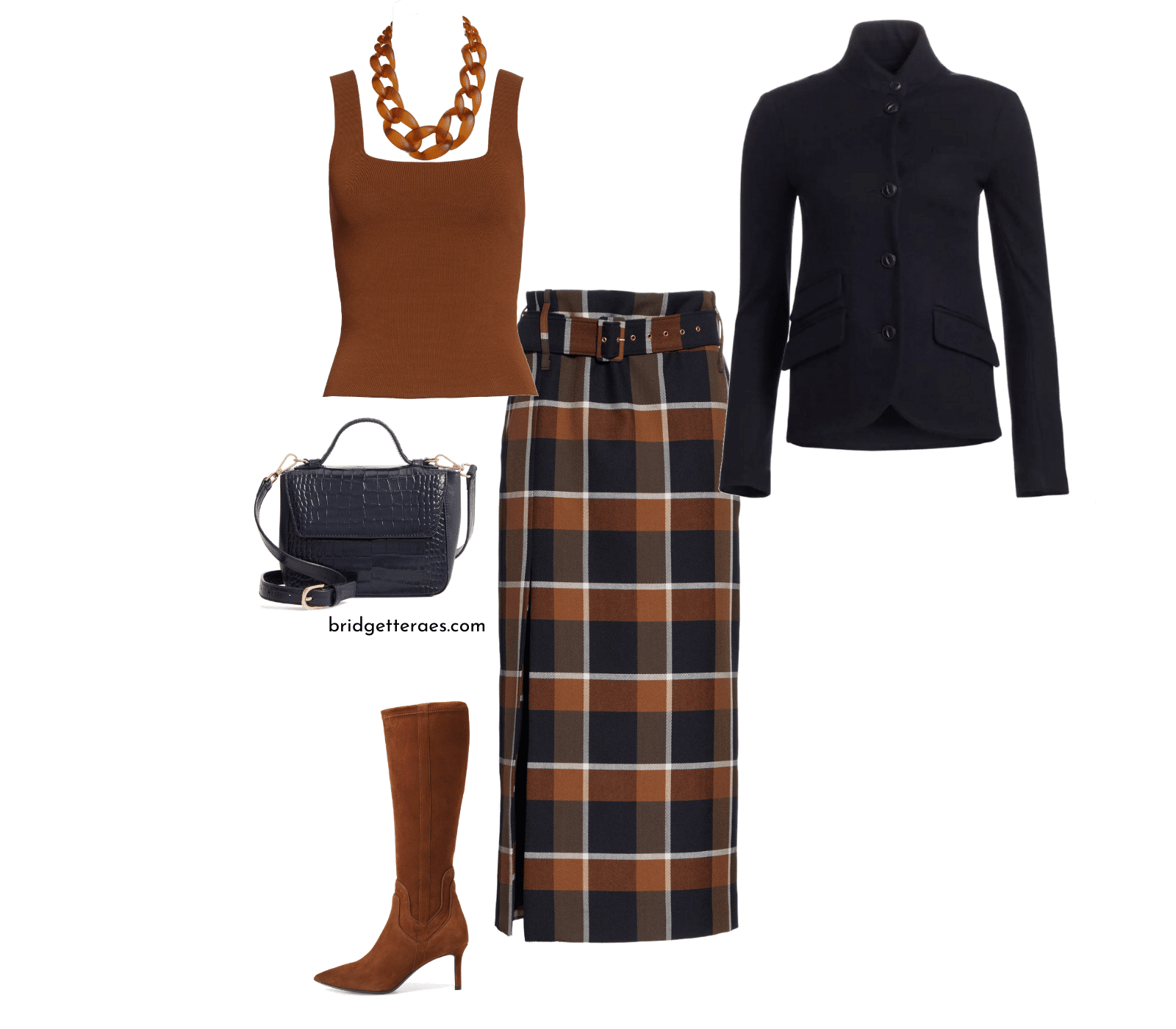 Le marron épouse ici le bleu marine. La jupe à carreaux Staud offre une manière subtile de s’approprier la couleur sans la porter près du visage. Pour celles tentées par une association plus affirmée, le top marron Vince s’impose naturellement. La veste marine structure la silhouette, tandis que les bottes marron Aquatalia, le sac bleu marine Nordstrom et le collier châtaigne Knotty peaufinent un look tout en nuances.