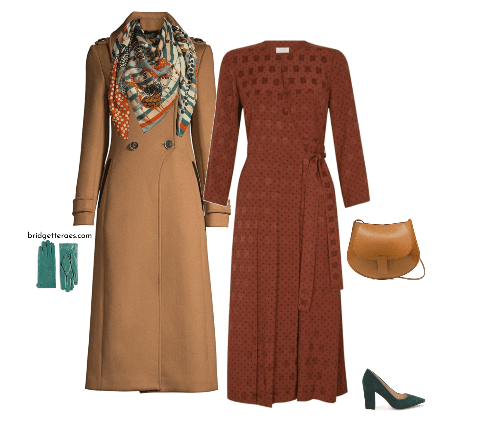 Place à la démarche ton sur ton, agrémentée d’un clin d’œil coloré. Une robe marron Hobbs s’habille d’un manteau camel Mackage. L’écharpe imprimée Rumiso, les gants en cuir vert aqua et les escarpins vert sapin bousculent la monotonie, tandis qu’un sac camel Jill Sander vient équilibrer l’ensemble. L’élégance, ici, se niche dans le détail inattendu.